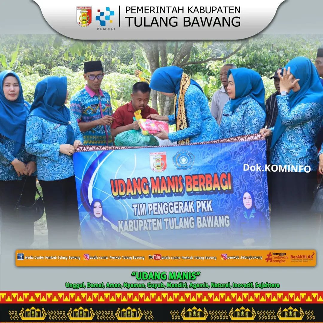 Pada kesempatan tersebut juga, TP PKK Tulang Bawang menyalurkan bantuan sosial berupa 22 paket sayur mayur dan sembako kepada masyarakat yang membutuhkan. Bantuan ini merupakan bagian dari Program Berkah Udang Manis yang diinisiasi Bupati Tulang Bawang dan dijalankan bersama TP PKK serta berbagai pihak, Kehadiran beliau disambut hangat masyarakat yang antusias mengikuti kegiatan tersebut.