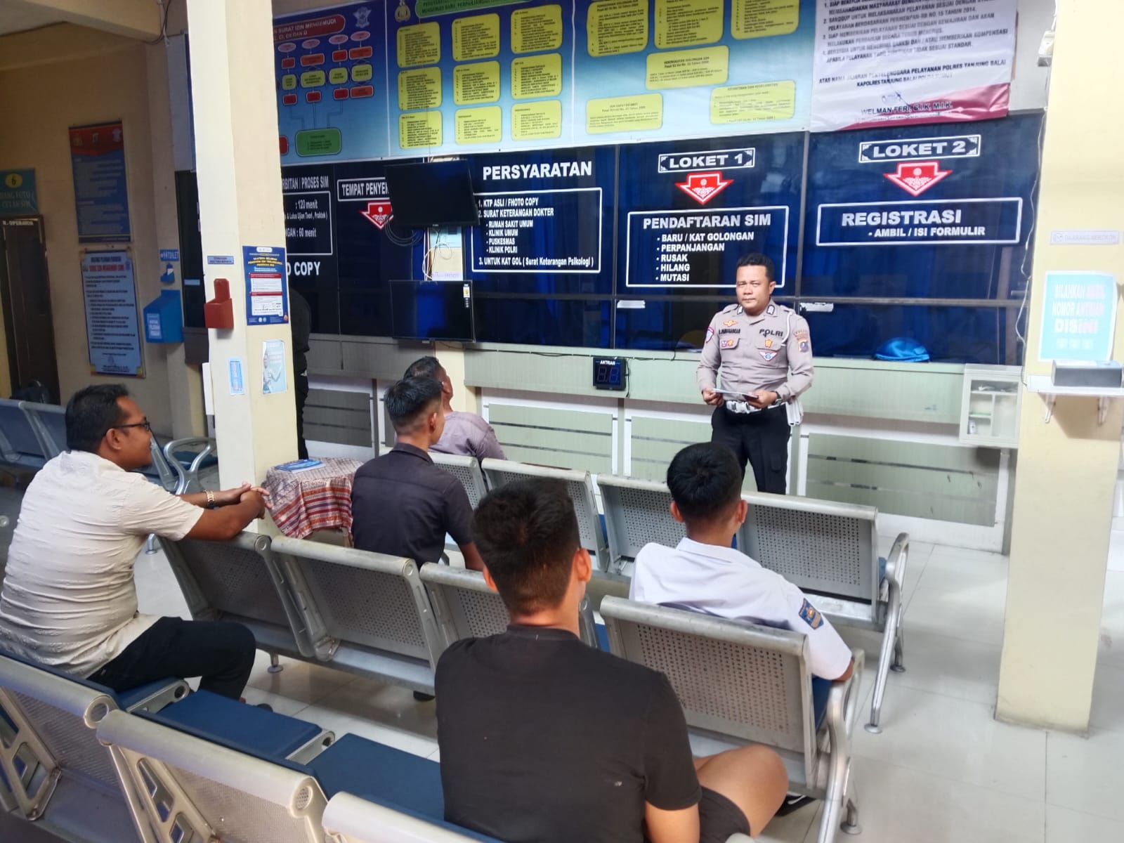 Masyarakat yang sedang mengantre diberikan penjelasan mengenai pentingnya kelengkapan surat-surat kendaraan sebagai bagian dari budaya tertib berlalu lintas.